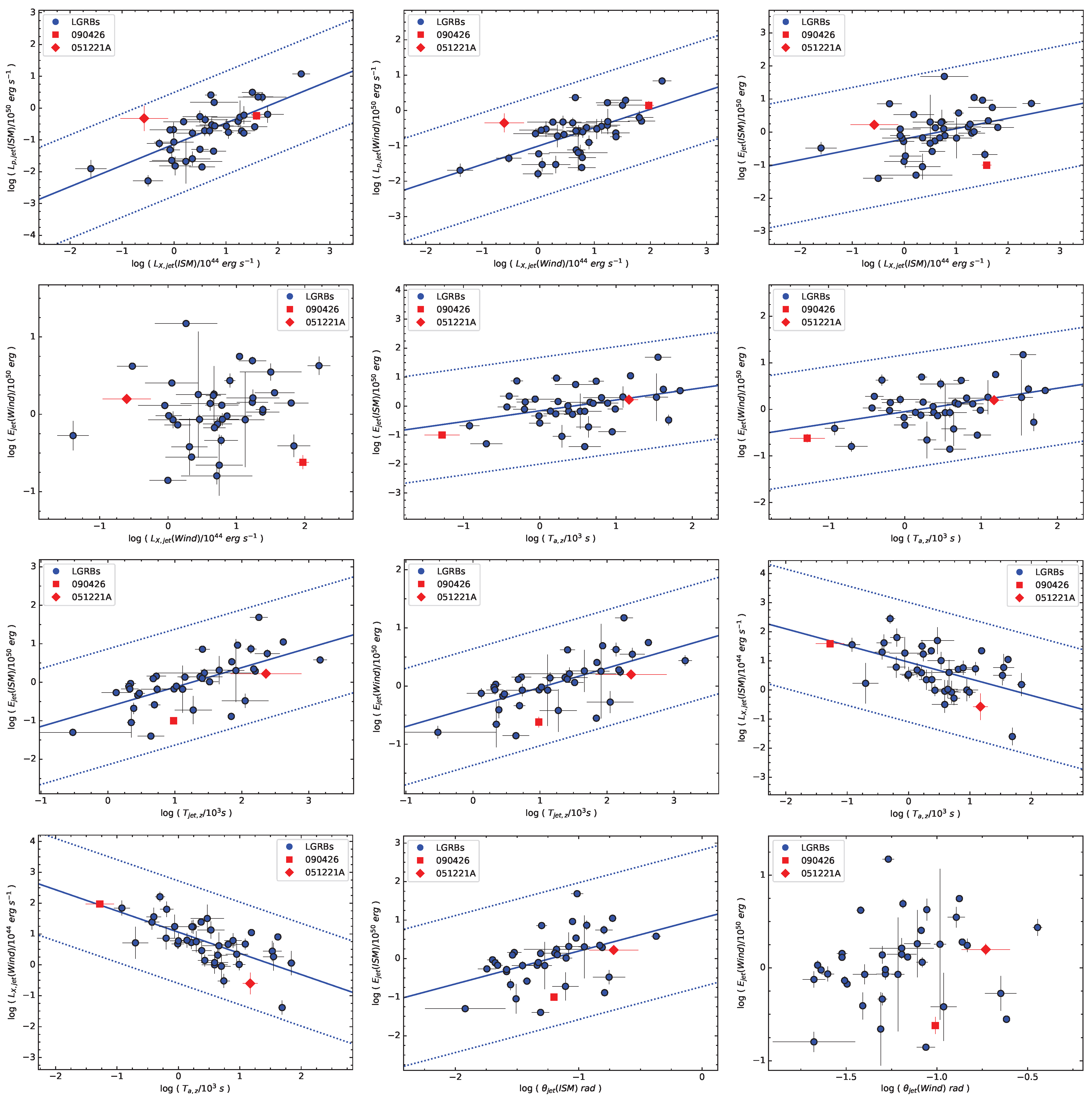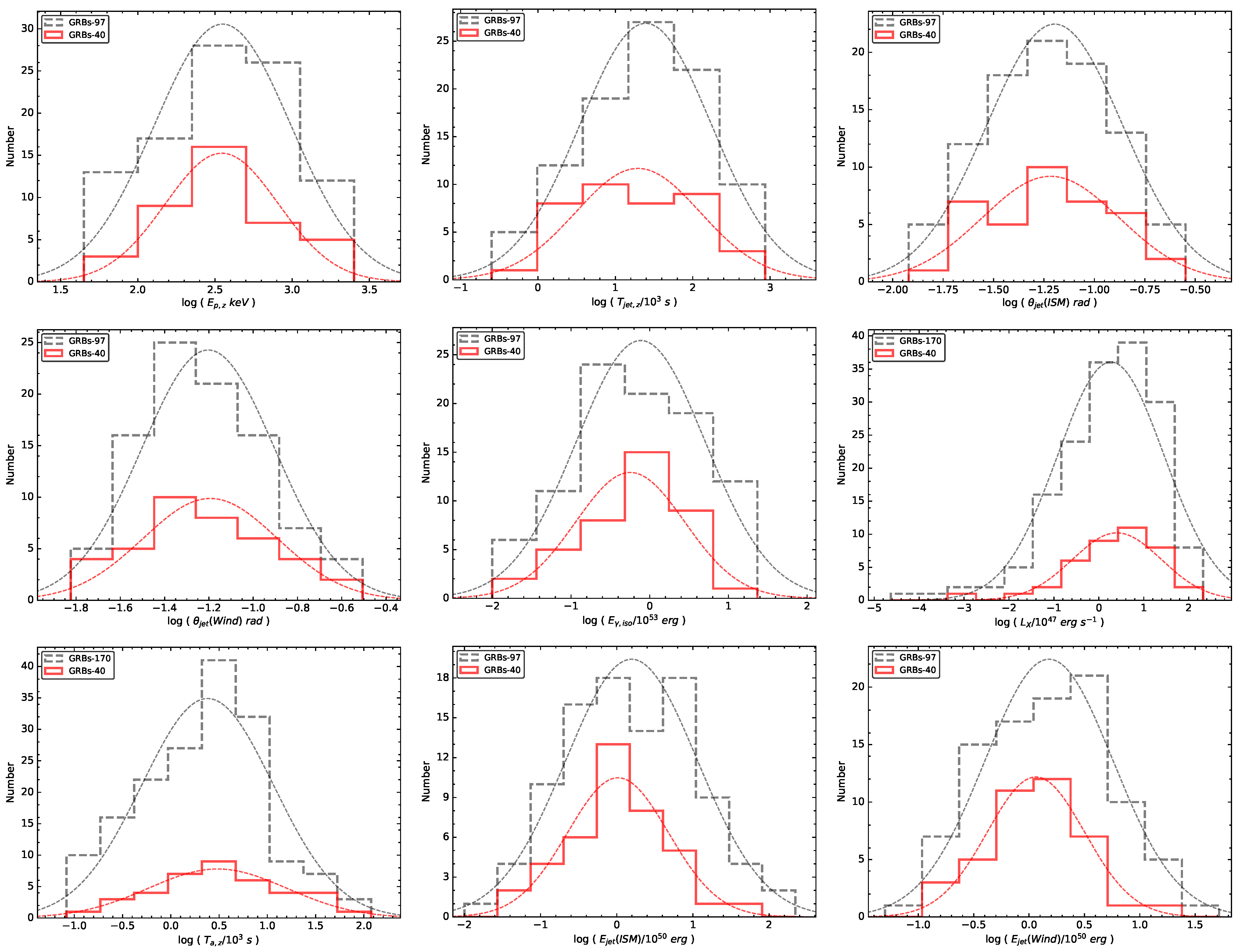 - Zhao, W.; Zhang, J.-C.; Zhang, Q.-X.; Liang, J.-T.; Luan, X.-H.; Zhou, Q.-Q.; Yi, S.-X.; Wang, F.-F.; Zhang, S.-T. Statistical Study of Gamma-Ray Bursts with Jet Break Features in Multiwavelength Afterglow Emissions. Astrophys. J. 2020, 900, 112. [Google Scholar] [CrossRef]