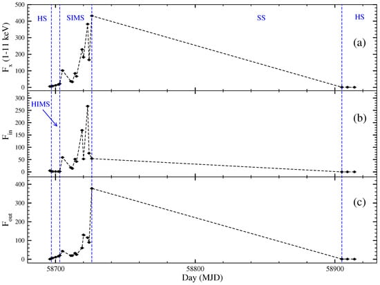 During an outburst, BHs can be found in different spectral states (see Debnath et al., 2015, 2017 [6,7] and references therein). Typically, during a complete outburst, the BH goes through four spectral states: hard state (HS), hard intermediate state (HIMS), soft intermediate state (SIMS), and soft state (SS) [8,9,10]. In the rising phase, the source evolves from HS to SS via HIMS and SIMS and reverses this path in the declining phase. An outburst is known as a ‘failed’ outburst if one or more softer states are missing [7].