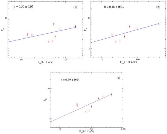 Figure 3a presents the correlation between radio flux () and inflow X-ray flux in 1–11 keV (, 1–11 keV), and the obtained value of the correlation index is . The value of the Pearson correlation coefficient is , with a p-value of .