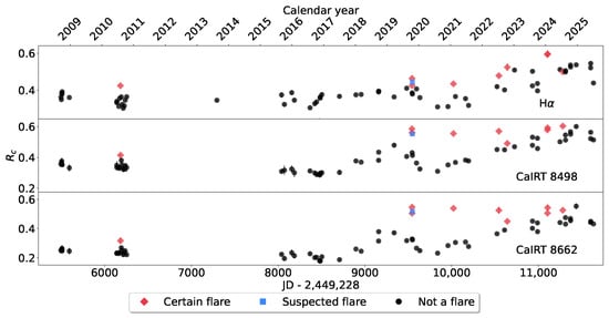 Figure 3 shows the temporal evolution of the activity indicators H and the two lines of the CaIRT between 2008 and 2025. Measurements of the CaIRT lines are only available from 2008 onward and are used as a confirmation of the long-term activity level estimated from the profile of H, as well as to confirm the presence of a flare, as described in Section 2. In Figure 3, it can be seen that the behavior of the CaIRT lines generally follows that of , with some particular flares (in 2020 and 2021) being more pronounced in the CaIRT lines. The behavior of these two lines helps identify possible flares in the dataset.