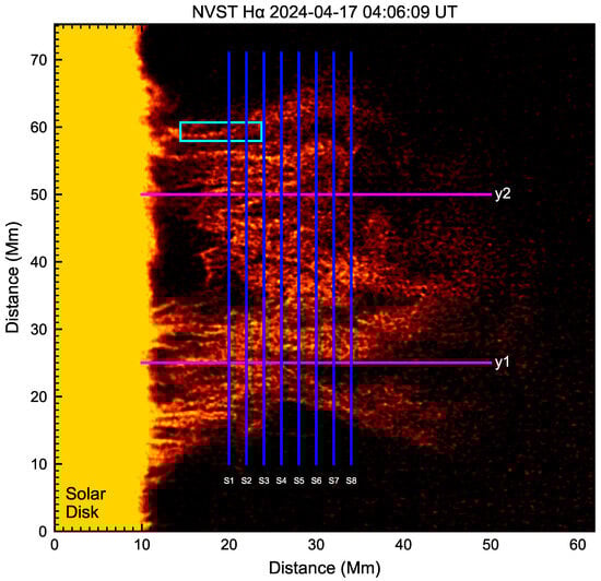 NVST H image of the quiescent prominence on 17 April 2024 at 04:06:09 UT. The scale in Figure indicates the actual distance in megameters (Mm). The blue lines represent the eight slits marked by S1, S2, S3, S4, S5, S6, S7, S8 to plot the time–distance maps in Figure 2. The distance between the two slits is 2 Mm (about 16 pixels). Two purple lines marked by y1 and y2 are vertical to the solar surface to plot the time–distance maps in Figure 8. The cyan box show a single thread used to be sliced at different positions in Figure 7.
