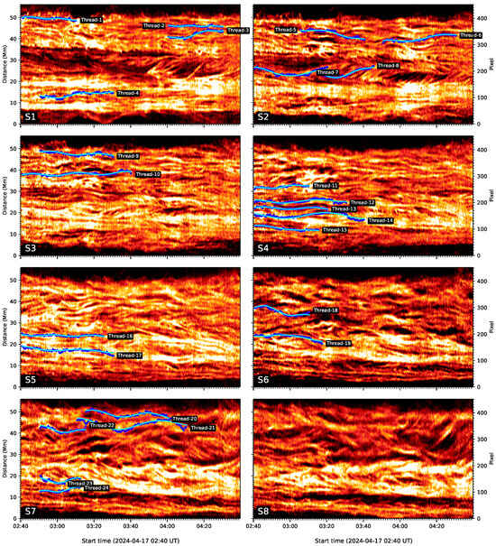 Time–distance maps along the slits of S1–S8 in Figure 1. The blue dots trace the individual threads with the local maximum intensity. The green lines represent sinusoidal fitting curves. In total, 24 oscillating threads are identified and marked by Thread-1 to Thread-24.