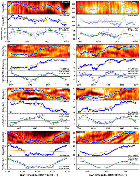 Zoomed-out image of Thread-1–Thread-8 to show the function fitting in detail. For each thread, the blue dots trace the threads with the local maximum intensity, and the green lines represent the function (1) fitting (a). The orange line is the drifting motion of the threads (b). Each (c), the blue dots are thread behavior removing the drifting motion and the green lines shows the sinusoidal fitting.