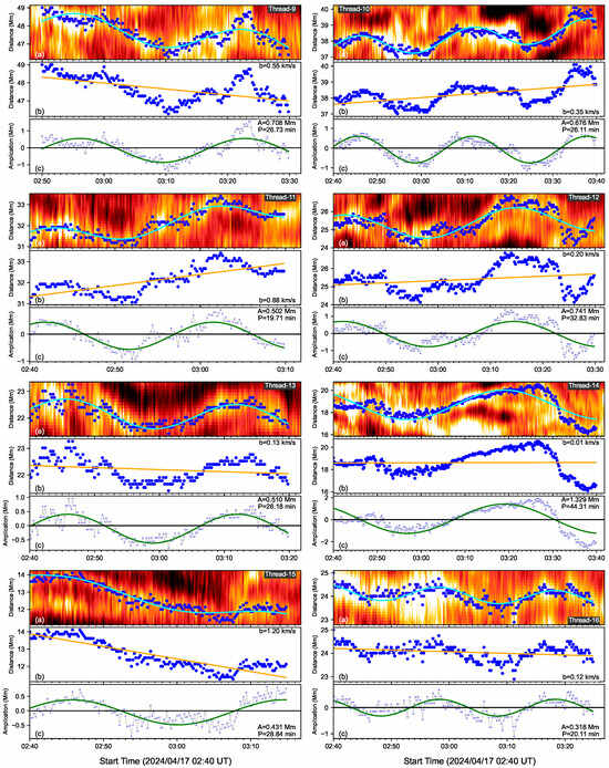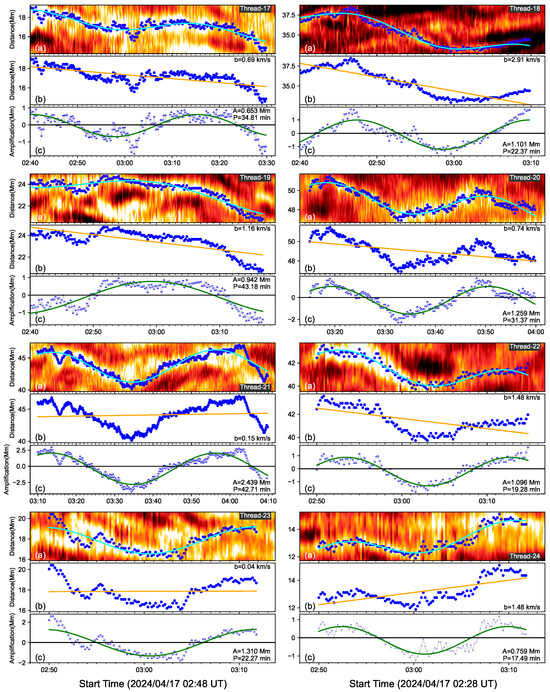 where A represents the amplitude, P represents the oscillating period, b represents the drifting speed of the thread. The blue solid lines are fitting results shown in Figure 2. Figure 3, Figure 4 and Figure 5 show the fitting results of 24 threads in detail. For each thread, for example, Thread-1 in Figure 3, top panel plots the time–distance map of H intensity with a small window from 02:40 UT to 03:12 UT in its lifetime. The blue dots trace the location fluctuation on the thread. The green line represents the function fitting. Second panel plots the thread with the blue dots and the drifting motion with the orange line. Thread-1 has a drifting speed of 0.65 km s−1. Third panel shows the oscillating behavior of Thread-1 removing the drifting component. A complete oscillation is found in Thread-1 as the sinusoidal function with a period of 16 min. For the Thread-2, it has a drifting speed of 0.35 km s−1, but the drifting direction is inverse from the Thread-1. Namely, Thread-1 and Thread-2 are drifting parallel to the solar surface, but with opposite directions. In this paper, the thread drifting speeds are estimated but the directions are ignored.