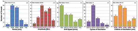 Figure 6 plots the histograms of the fitting parameters, including the periods (a), amplitudes (b), drifting speeds (c), cycles (d), and the lifetime (e) of oscillations, and the mean values of these parameters are given. About 79% (19/24) of the threads have an oscillating period between 15 min and 35 min; 75% (18/24) of the threads have an oscillating amplitude between 0.5 Mm and 1.5 Mm; 58% (14/24) of the threads have a small drifting speed less than 1 km s−1. Here, the speed direction can be ignored. These threads have a mean period of 27.7 min, a mean amplitude of 0.92 Mm, a mean drifting speed of 1.0 km s−1, a mean cycle of 1.5, and a mean oscillating lifetime of 38.5 min. Most of the threads, 87% (21/24), display one cycle in our observation interval.
