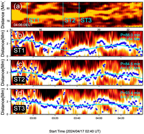 Oscillations at three positions of the thread encircled by the cyan box in Figure 1. (a), H image of the thread at 04:06:09 UT. (b–d) Time–distance maps corresponding to the perpendicular slits marked by ST1, ST2, and ST3 in (a).