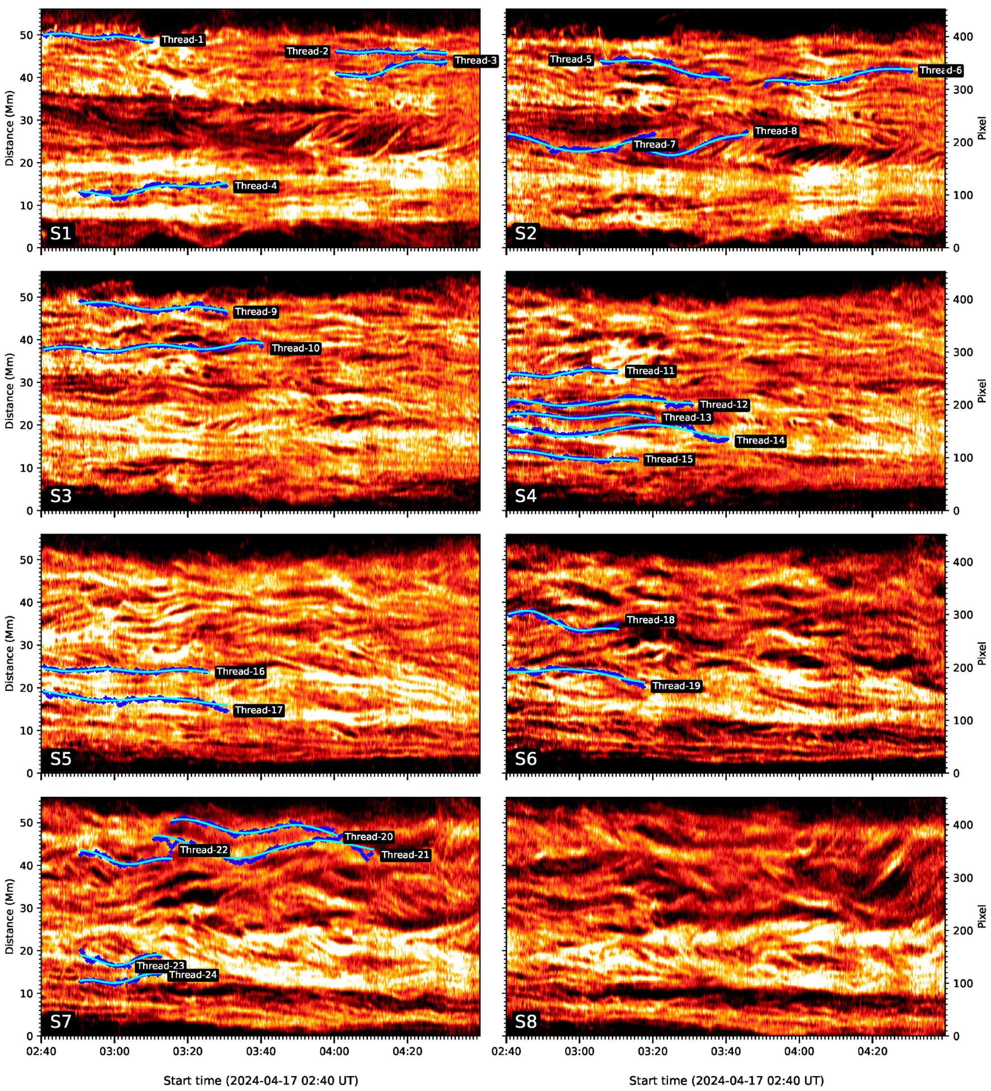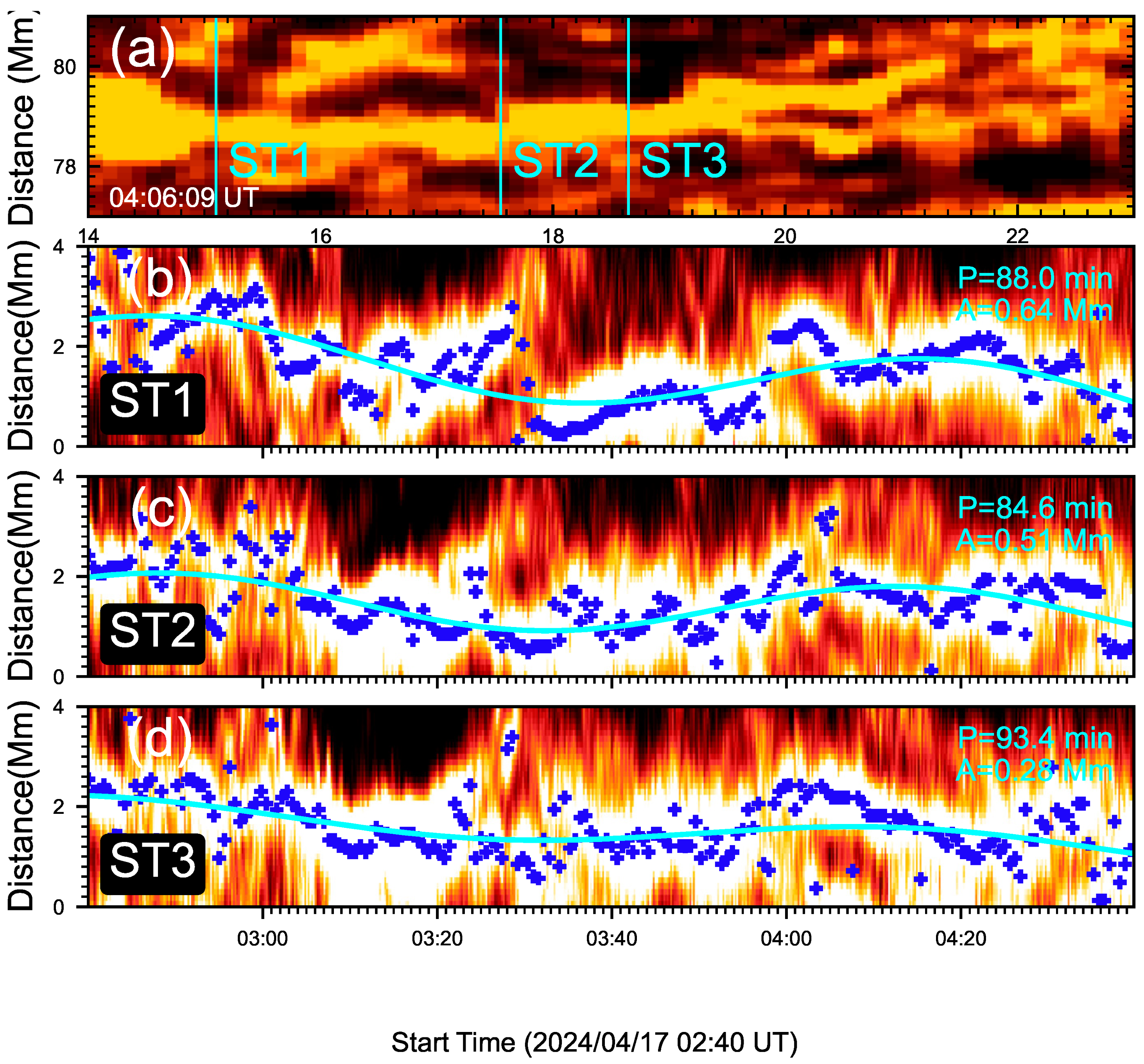 | Thread | P (min) | A (Mm) | b (km s−1) | Cycles of Oscillation | Lifetime of Oscillation (min) |