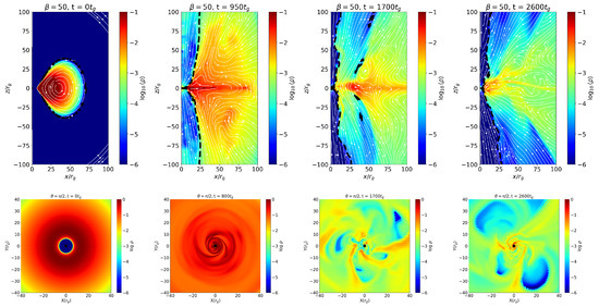 The bottom panels show the corresponding slices in the equatorial plane (), illustrating the orbital motion and gradual inward transport of matter. As the simulation evolves, the torus develops prominent spiral density structures driven by magnetorotational instability (MRI)-induced turbulence. The model exhibits enhanced magnetic activity and stronger turbulent motions compared to the case (Figure 2), where the flow remains relatively more laminar and the magnetic pressure is less dominant.