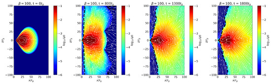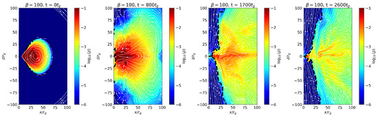 Figure 3 and Figure 4 present similar diagnostics for the second magnetic configuration, , with and 100, respectively, and black hole spin . In these models, the field topology results in more efficient vertical collimation of magnetic field lines in the polar regions. supports a more symmetric and well-collimated outflow compared to . In particular, the jet cone is noticeably broader and more collimated for the case, suggesting enhanced magnetic support and a stronger, magnetically dominated spine. Furthermore, the accretion torus in evolves more rapidly than in , reaching jet launching phase at earlier times. This faster evolution can be attributed to the stronger initial poloidal flux and enhanced magnetic stresses in , which promote more efficient angular momentum transport and rapid advection of magnetic flux toward the black hole.
