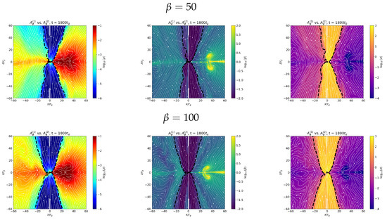 We have simulated 5 different models. The first vector potential configuration, , is explored with plasma beta values and 100, while the second configuration, , is studied with , 100, and 500.