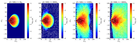 Torus density () evolution along a poloidal plane with magnetic field streamlines at , 800, 1300, and . for , due to the vector potential and spin parameter .