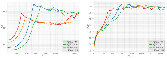 Time evolution of the (left) poloidal and (right) toroidal magnetic field strengths for all four simulation setups— and with initial plasma and 100.