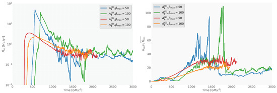 Figure 8 presents the time evolution of the mass accretion rate through the inner boundary and the normalized magnetic flux for all four simulation setups, where the latter is computed as