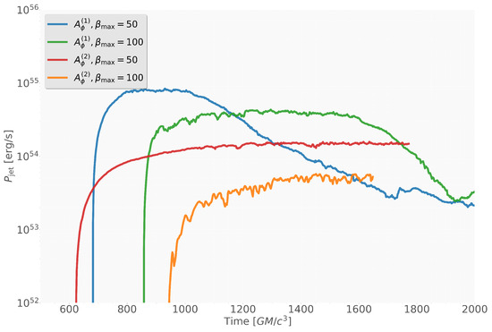 Time evolution of the jet power for the four simulation setups: and with initial plasma and 100.