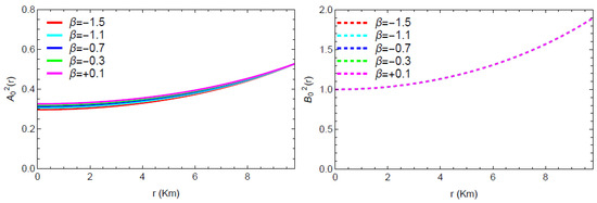 Profiles of the metric coefficients ‘’ and ‘’, with respect to the radial coordinate r.