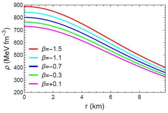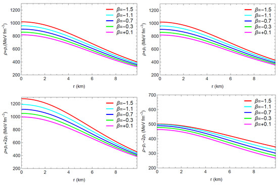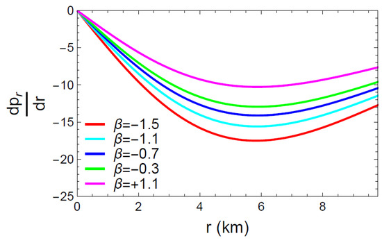 Figure 15 shows that radial pressure vanishes at the boundary for but that acquires a positive value at the stellar boundary for . It is evident that the minimum value of is . Figure 16 exhibits that for and for . That justifies the fact that cannot be the maximum value of , whereas can be the largest value of .