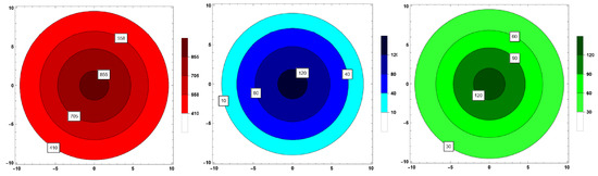 Figure 2 and Figure 3 demonstrate that the physical quantities () remain finite and feasible through the stellar radius; that is, no singularity occurs. The aforementioned figures also show that the radial pressure drops to zero at km, and the energy density and pressures decrease monotonically toward the boundary. The graph of the anisotropic factor with respect to the radial coordinate r, as presented in Figure 4, shows that for various values of . Thus, the anisotropic nature turns outward-directed and repulsive, and thereby the proposed model depicts a more huge and compact star configuration. The radially symmetric diagram for matter variables with is shown in Figure 5.