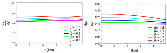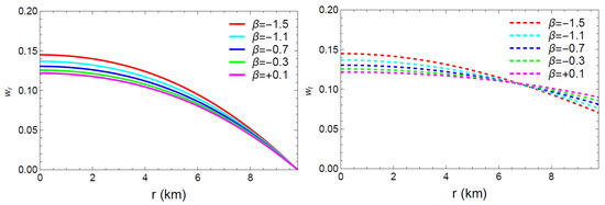 Figure 6 displays the profiles of these two components () for various values of . As can be seen from the graphs, the radial and tangential components of the state parameters both monotonically decrease and fall between 0 and 1 throughout the matter distribution. Thus, in the case of our model, the EoS parameters met the physically correct conditions.