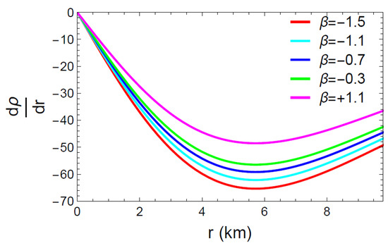 Figure 7, Figure 8 and Figure 9 show a graphical representation of the first order derivatives of , and . It is simple to infer from the figures that the energy density (), the radial pressure () and the tangential pressure () met the requirements of Equation (37) and reached their maximum value at the center of the celestial objects.
