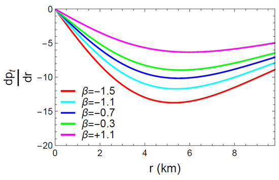 The Tolman–Oppenheimer–Volkhoff equation [51,52], or the TOV equation, is applied to examine whether the present model is in a hydrostatic state. The TOV equation in gravity with an anisotropic fluid configuration is defined as follows: