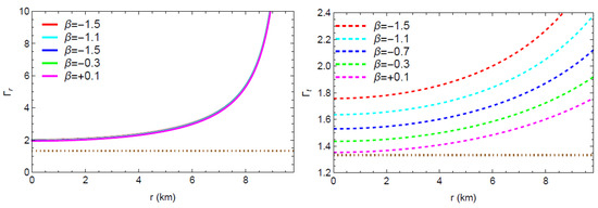 Plots of these factors in Figure 11 reveal that, for the compact star pulsar 4U1608-52 with various values of the model parameter , and throughout the whole interior region. As a result, the model represents a dynamically stable stellar configuration.