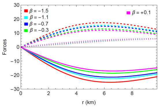 Using the modified values for , and +0.1 as in the previous figures, the profiles of and for the present stellar model are shown in Figure 14. As seen in the figure, the condition of equilibrium for the system is amply justified by the reciprocal impact of the three forces and .