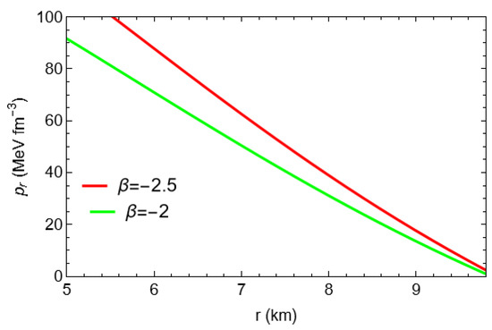 Plots of radial pressure with respect to the radial coordinate ‘r’ for the compact star pulsar 4U1608-52 corresponding to and .
