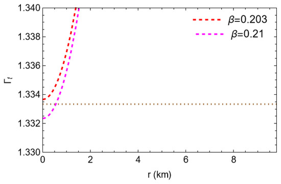 Plots of tangential adiabatic index with respect to the radial coordinate ‘r’ for the compact star pulsar 4U1608-52 corresponding to and .