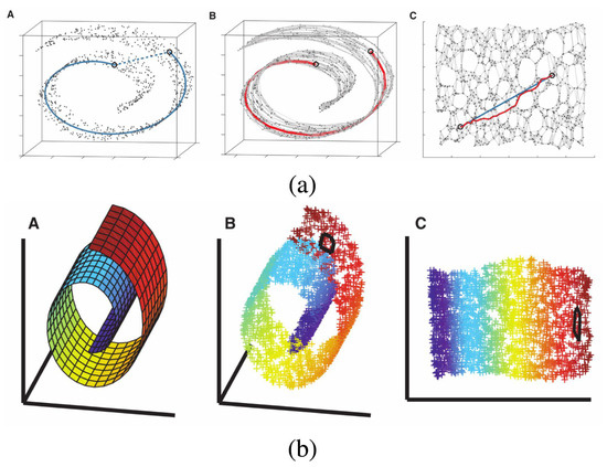 Example of dimensionality reduction with (a) Isomap and (b) LLE (Section 2.2.2), showing how the two algorithms unroll a ‘Swiss roll’ manifold. Each panel contains three mini-plots labeled A–C. In (a), A shows the geodesic distance between two points on the manifold (blue line), B shows the corresponding distance along the neighborhood graph (red line), and C presents the resulting low-dimensional embedding after unfolding. In (b), A–C correspond to the same stages, with color used to represent the local structure of the manifold. The change in the circled area between B and C illustrates how LLE preserves local structure during the unfolding. The figure is taken from Fotopoulou [15], licensed under CC BY 4.0 (https://creativecommons.org/licenses/by/4.0/).