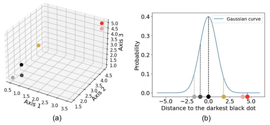 Example of how t-SNE measures the affinity between two points, demonstrated using a three-dimensional dataset, shown in (a). For example, the distance from any dot to the darkest black dot is computed, and the corresponding probability is determined using a Gaussian kernel, as shown in (b).