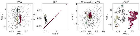 Results of the dimensionality reduction algorithms applied to the same five-dimensional dataset. The algorithms include PCA, LLE, non-metric MDS, and t-SNE. The five-dimensional dataset is clustered with DBSCAN before being reduced to two dimensions, where different colors represent different clusters, and the black dots represent the outliers. This figure illustrates how the clusters are distributed under different dimensionality reduction algorithms.