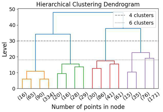 Hierarchical clustering (HC) is a clustering algorithm that identifies clusters across all scales without requiring a specified number of clusters [16]. HC can be performed in a top-down (also known as divisive) or bottom-up (also known as agglomerative; [137]) approach. A diagram demonstrating the bottom-up clustering dendrogram is Figure 10. In the bottom-up approach, the N elements start as N independent clusters, each containing a single element. The two nearest clusters are then merged, reducing the number of clusters from N to . The distance between clusters is calculated in various ways, generating significantly different results. One example is to sum the distances between all possible pairs of points, with one point from each cluster, and divide by the product of the two numbers of elements from the two clusters [16]. The merging procedure is repeated until there is only one cluster, containing all N elements. The top-down approach is the reverse of the bottom-up approach. Instead of merging clusters, this method divides a single cluster into two at each step. By imposing HC, all possible clustering with all possible numbers of clusters are generated, and the user can choose the level (i.e., the number of clusters) for investigation.
