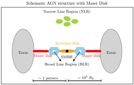 A schematic illustration of a maser disk within the standard AGN paradigm, highlighting its location relative to the torus, broad-line region (BLR), narrow-line region (NLR), and the central black hole. Past X-ray observations suggest that a maser disk may be the inner extension of an AGN torus [29]. The inner boundary of a maser disk is typically consistent with the dust sublimation radius and has a radius of ∼1 × 105 RS [30], where RS indicates the Schwarzschild radius of the center black hole.