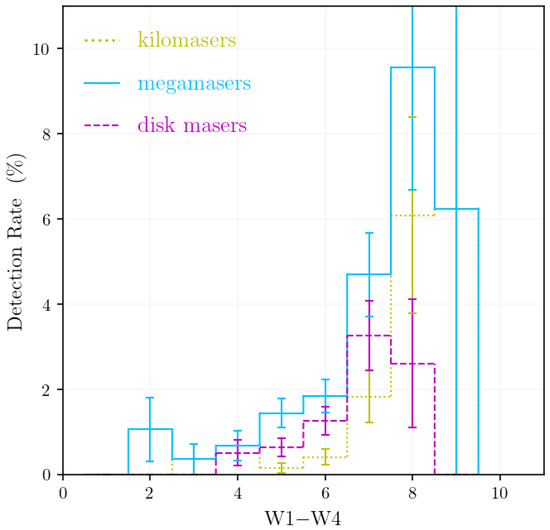 The maser detection rates Rmaser as a function of mid-IR WISE color W1–W4. For all types of maser systems, e.g., Ref. [49], their detection rates increase rapidly with the W1–W4 color.