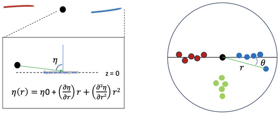 The left panel shows the representative morphology of a nearly edge-on, warped maser disk conceived in the three-dimensional disk modeling, which usually prescribes the inclination warp i(r) and the position angle warp η(r) as low-order polynomials (see the representative equation in the inset of the figure). The right panel shows the overhead view of a model maser disk, in which a maser spot can reside at any location of the disk, with its position described by polar coordinates (r, θ). The red, green, and blue dots/curves in the plots represent the redshifted, systemic, and blueshifted masers, respectively.