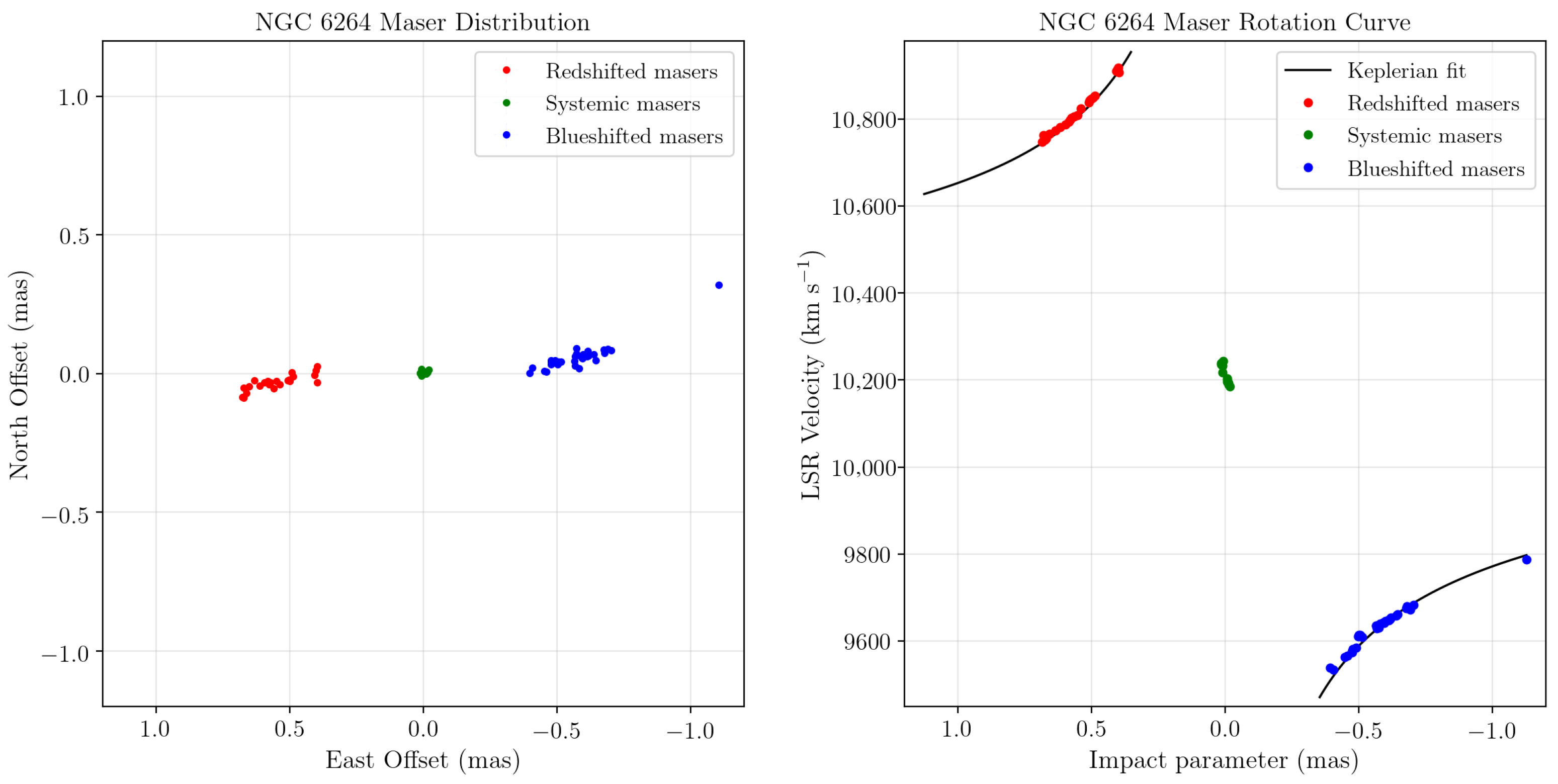 - Imaging and modeling: The final data cubes are CLEANed to produce spatial–velocity maps of maser spots. The measured positions and Doppler velocities are then fitted with warped, thin-disk models to yield SMBH masses and, when accelerations are available, geometric distances.