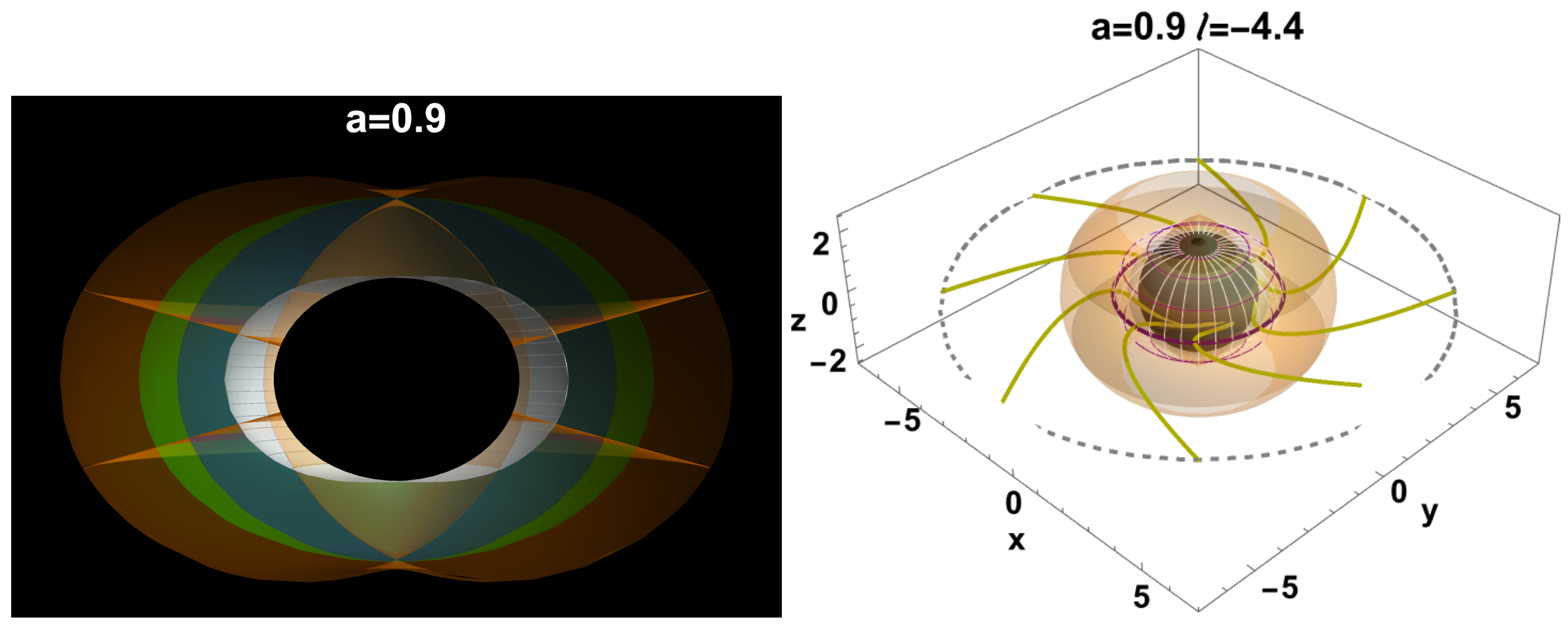 | 1 | Following [28], they are classified according to the number of “polar turning points”, or “half polar-orbits” they complete before escaping to infinity; that is, the number of half latitudinal (polar) oscillations around the BH photon’s shell prior to reaching infinity. A discussion on the possibility of fully distinguishing the photon rings (in the emission ring) with future development of EHT and with space-based stations is in [11]. |