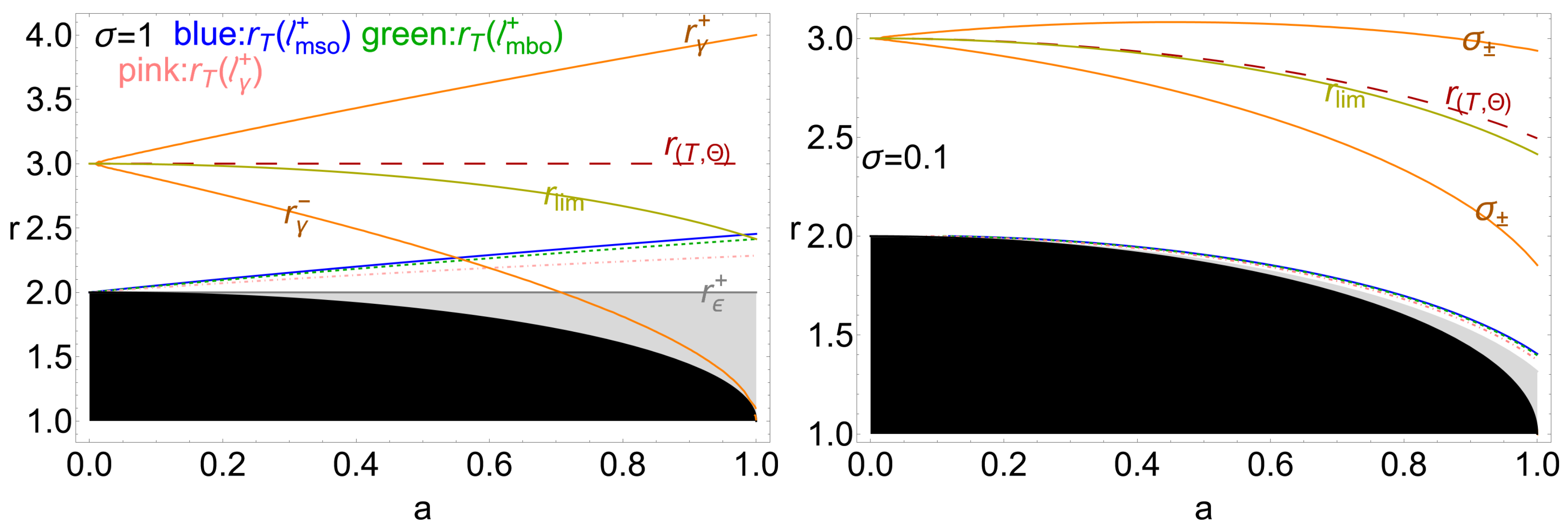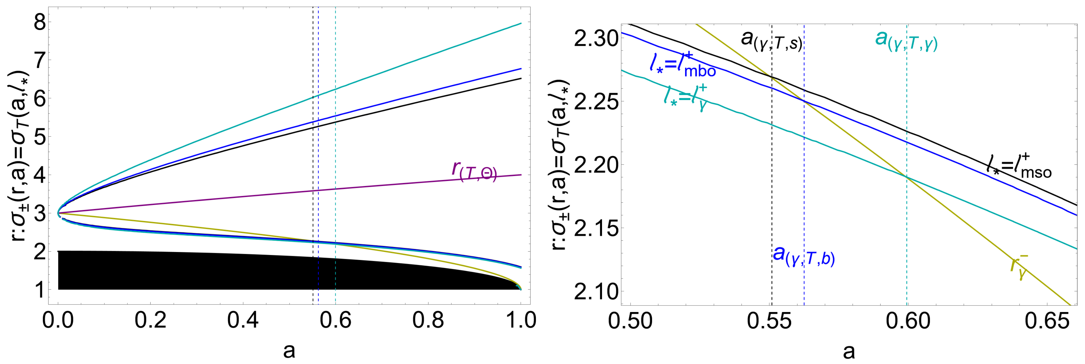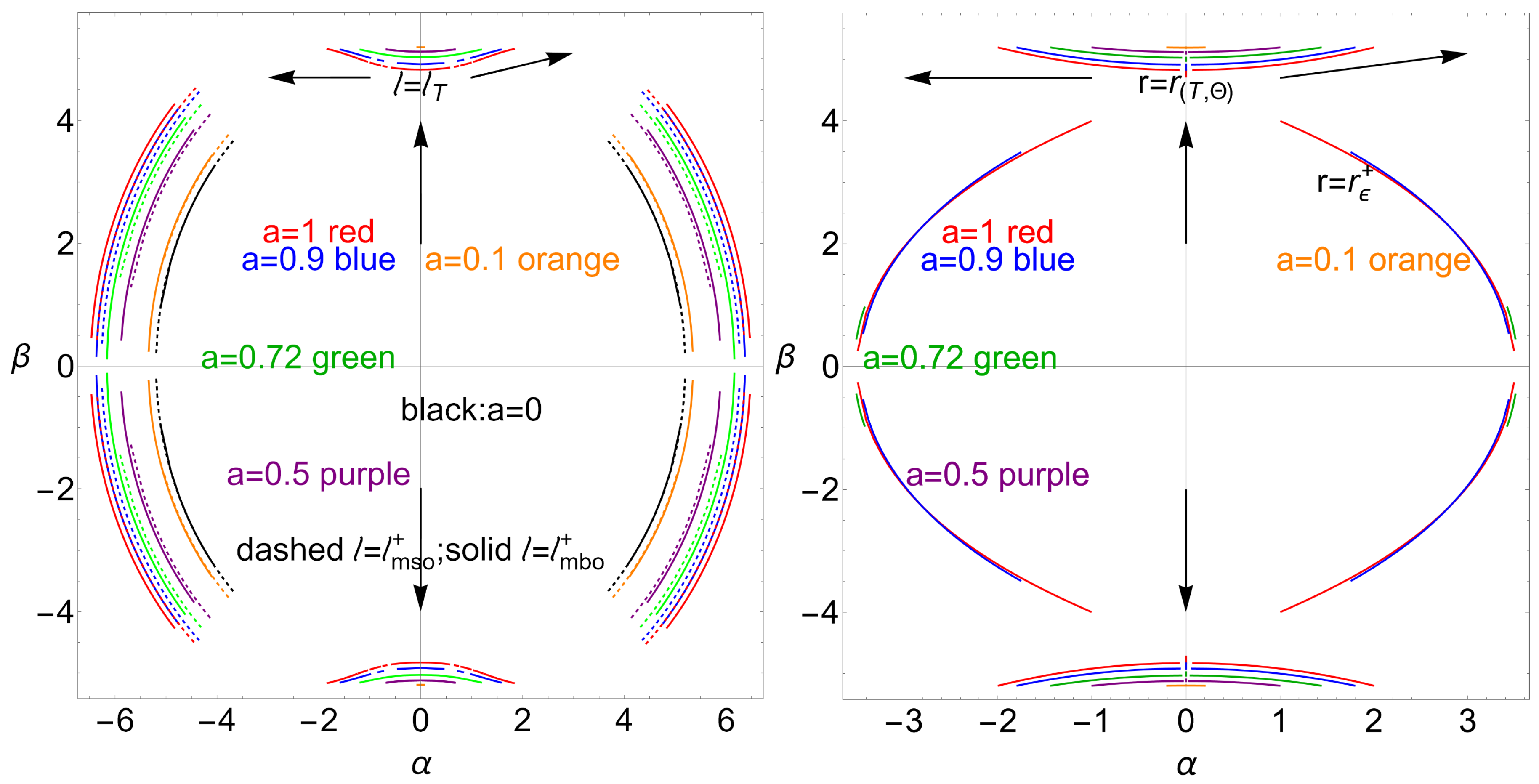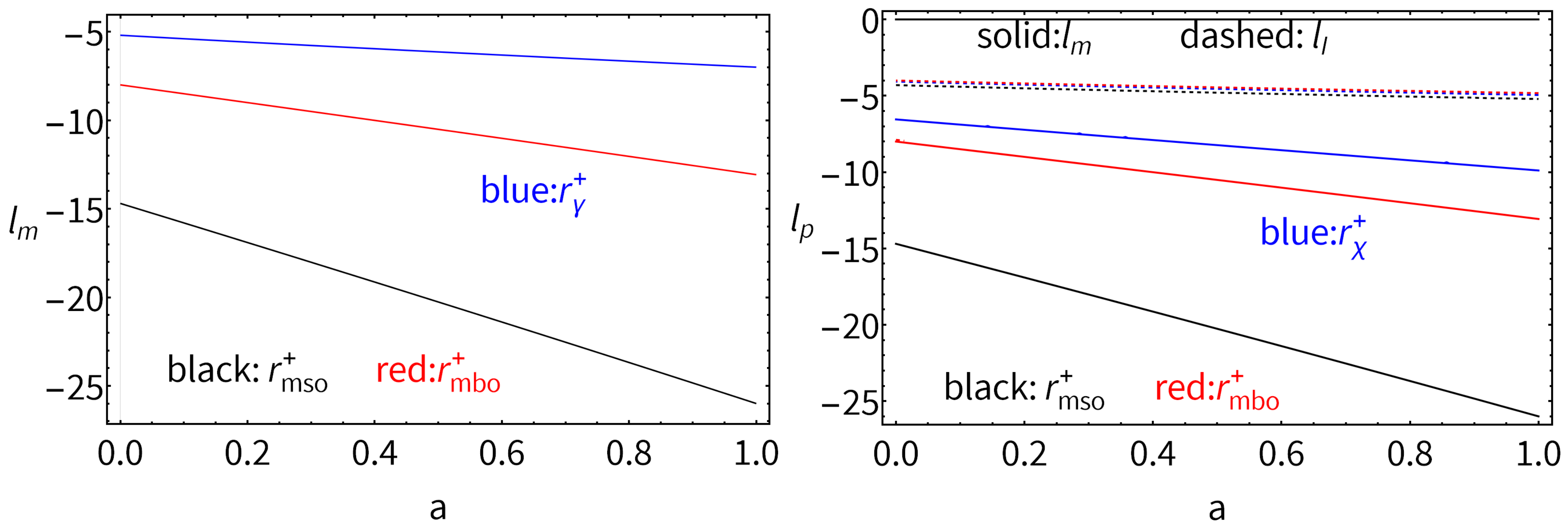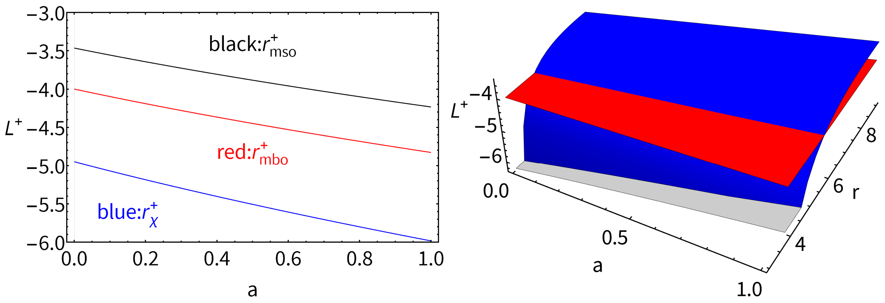 | 3 | The BH is described, in many analyses, as having spin , determining the rotation orientation (defined by the angular momentum vector) of the (equatorial and axisymmetric) accretion disk and flow (both the direction and alignment of jet emission are also often considered). In this work, we consider a BH with spin , and an equatorial, axisymmetric, disk characterized by a well-defined relativistic specific angular momentum , corresponding to co-rotating and counter-rotating disks, respectively. Note, BH spin constraints in the literature are provided, for M87* and SgrA* accretion disk (and jet) systems; in terms of BH spin values , for co-rotating (or prograde) disks; and in terms of BH spin values for counter-rotating (or retrograde) disks. (Some ambiguities in this convention may arise in the case of accretion models based on a tilted (or misaligned) disk. The alignment axis of the jet within the system may also contribute to potential ambiguities. Further ambiguities emerge when considering multiple accretion disks, which may be relatively counter-rotating, orbiting the central BH, or if an accretion disk has an internal ringed structure with a non-homogeneous distribution of angular momentum featuring co-rotating and counter-rotating parts within its structure, or if the definition of the rotation direction of the accretion flow is understood to refer to the flow components in terms of the toroidal velocity rather than to the relative angular momentum). Within this set-up, we consider particles of the accretion flow with angular momentum (from the disk), and angular velocity , which depends on ℓ and (for counter-rotating flows) can change sign. |