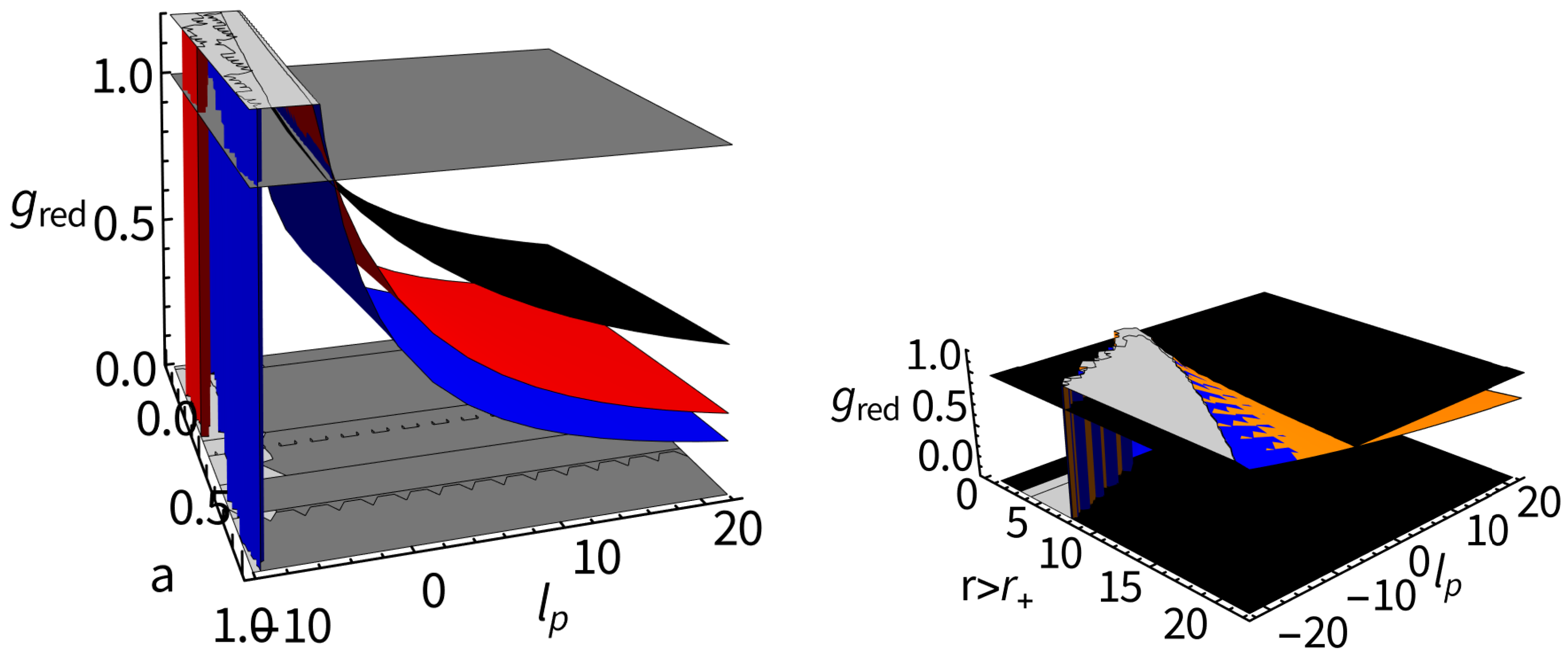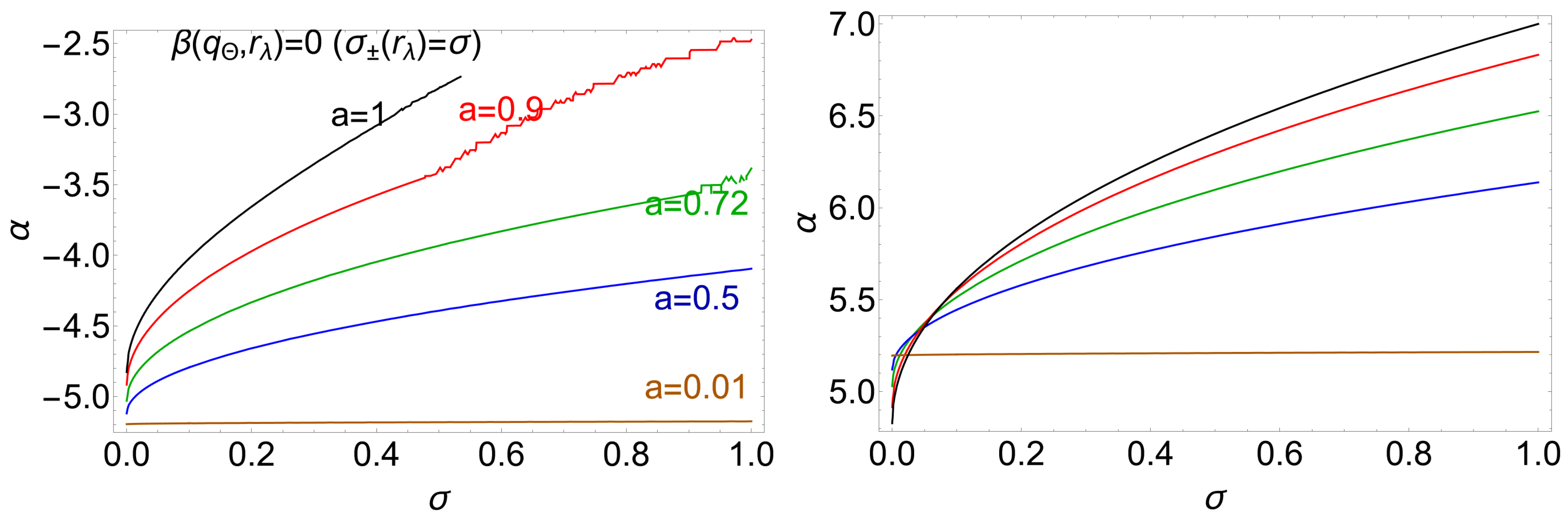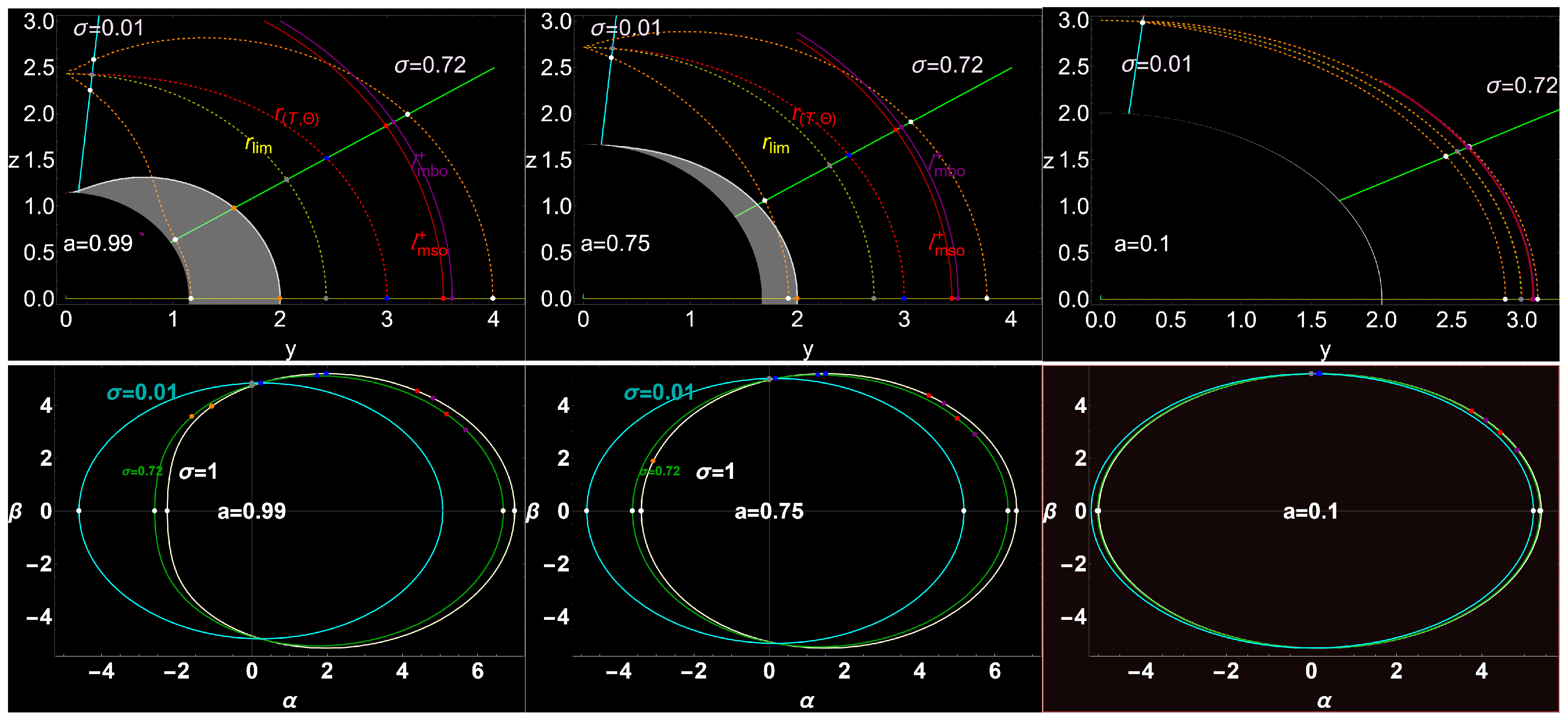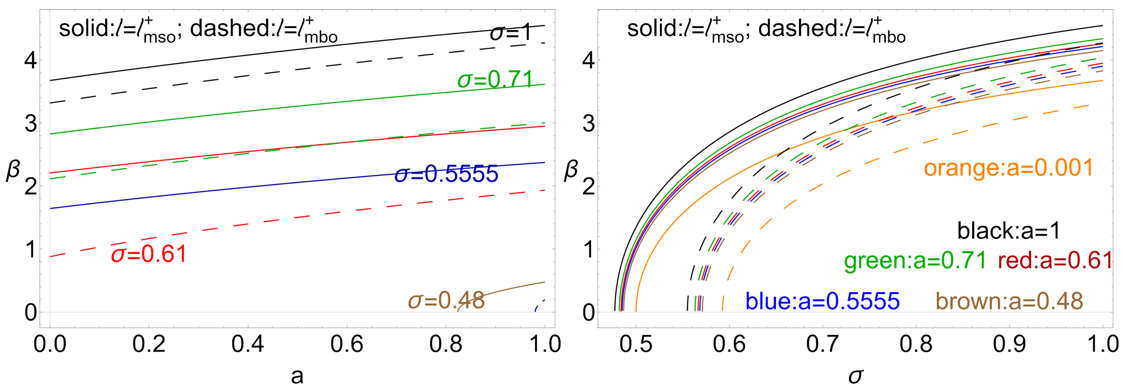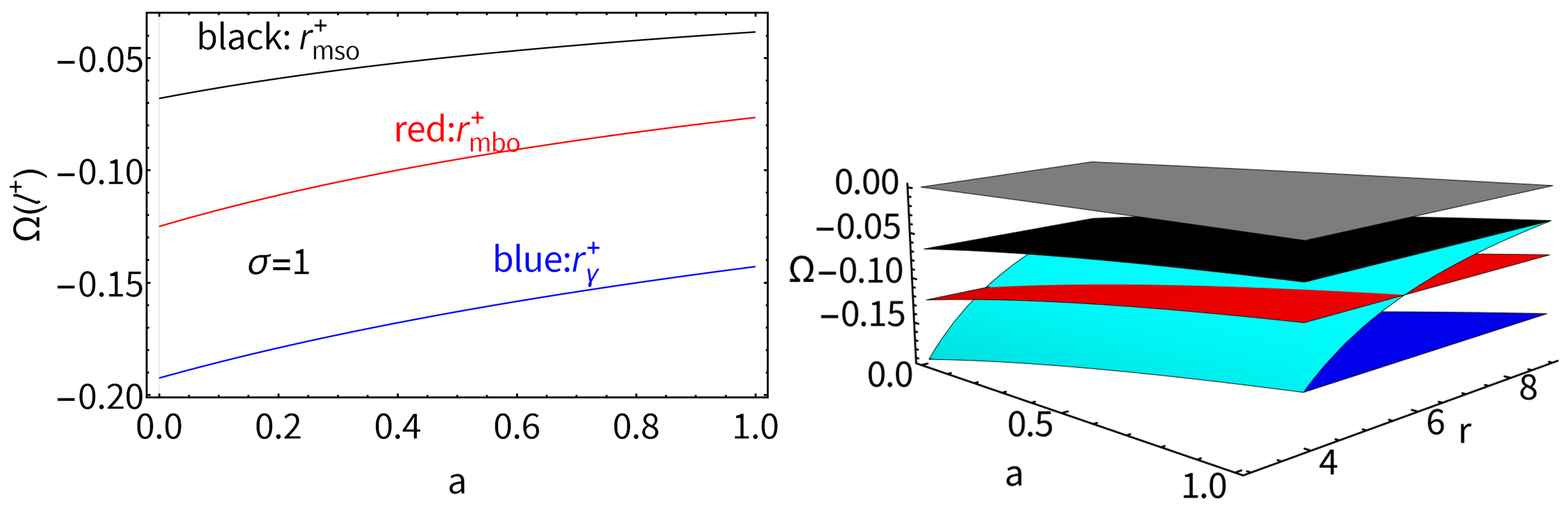 | 3 | The BH is described, in many analyses, as having spin , determining the rotation orientation (defined by the angular momentum vector) of the (equatorial and axisymmetric) accretion disk and flow (both the direction and alignment of jet emission are also often considered). In this work, we consider a BH with spin , and an equatorial, axisymmetric, disk characterized by a well-defined relativistic specific angular momentum , corresponding to co-rotating and counter-rotating disks, respectively. Note, BH spin constraints in the literature are provided, for M87* and SgrA* accretion disk (and jet) systems; in terms of BH spin values , for co-rotating (or prograde) disks; and in terms of BH spin values for counter-rotating (or retrograde) disks. (Some ambiguities in this convention may arise in the case of accretion models based on a tilted (or misaligned) disk. The alignment axis of the jet within the system may also contribute to potential ambiguities. Further ambiguities emerge when considering multiple accretion disks, which may be relatively counter-rotating, orbiting the central BH, or if an accretion disk has an internal ringed structure with a non-homogeneous distribution of angular momentum featuring co-rotating and counter-rotating parts within its structure, or if the definition of the rotation direction of the accretion flow is understood to refer to the flow components in terms of the toroidal velocity rather than to the relative angular momentum). Within this set-up, we consider particles of the accretion flow with angular momentum (from the disk), and angular velocity , which depends on ℓ and (for counter-rotating flows) can change sign. |