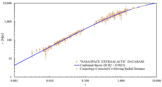 The coefficient of determination R2 = 0.9821 in Figure 1 documents approximately a 98% fit of the model regression function (20) to the observational data and confirms the realistic nature of the mathematical formula of the generalized Hubble–Lemaître law (20). In this situation, it is worth pointing out that its nonlinearity is a direct consequence of the conformal solution of Einstein’s gravitational Equation (1) without the cosmological term and it does not require the hypothetical concept of dark energy. Based on relations (17) and (18), the scaling function (7) and hence the metric tensor gμν takes a concrete form