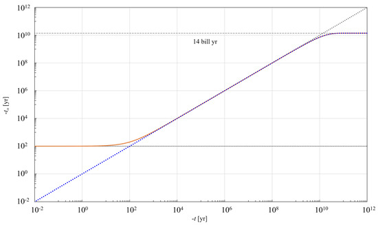The relationship between local and observation time is shown graphically in Figure 2 and their mutual deviation is at most 3.5% up to t ≈ −109 years, but below values of t ≈ −14 × 109 yr (into the past), the deviation becomes larger, and the extreme dilation of the observational time t results in a limiting boundary of the apparent origin of the local time min to, which appears to be the “age of the universe”.