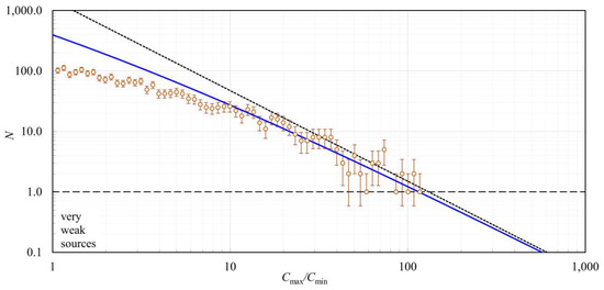 Theoretical fit — distribution of the total number N of γ-ray burst sources as a function of the Cmax/Cmin ratio for 2372 measured sources (A = 130, B = 0.12)—orange points. The black dashed line would correspond to a uniform distribution of sources in flat space with the standard Euclidean metric E3, as indicated by a formal extrapolation of the plot below the single-source detection level of N = 1.