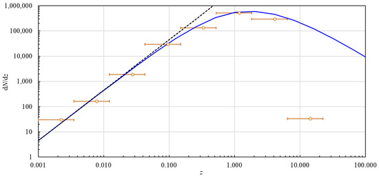 Theoretical fit — of the dependence of the number of quasars with the increase in redshift dN/dz on the magnitude of their redshift z (for parameter 4.5 × 106) [30]. Hollow orange points correspond to the average of all measured z values within the respective interval, and the horizontal line defines its width. The black dashed line --- corresponds to a uniform distribution of sources in flat space with Euclidean metric E3 and the standard linear form of Hubble–Lemaître law for redshift.