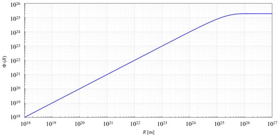 Dependence of the function Φ(R) (42) on the distance R of the observation sphere from the COP. The asymptotic plateau of the total intensity corresponds to a slightly smaller radius than predicted Robs ≈ 4.3 × 1026 m by the calculations of the standard model [31].
