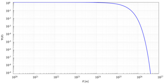 The dependence (44) is plotted in Figure 6. The radial distance r = 4 × 1026 m from the COP; at which the intensity contribution drops by nine orders of magnitude to 1 ppb of the original value; agrees very well with the Robs ≈ 4.3 × 1026 m of the observable universe according to the standard model [31].