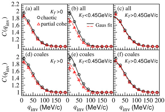 Figure 3 shows the two-kaon correlation functions for chaotic sources (circle symbols) and partially coherent sources (triangle symbols) in Pb-Pb central collisions at TeV using the AMPT model. Here, the left, middle, and right columns are the results in the kaon pair transverse momentum intervals, , , and GeV, respectively, in the laboratory frame. The top and bottom rows show the results for all of the identical (negative) kaons and the kaons generated by quark coalescence, respectively. We found that the two-kaon correlation functions for the kaons generated by particle scattering and decay have low statistics. In the low transverse momentum interval GeV, the correlation function intercepts near for the partially coherent sources are significantly lower than those for the chaotic sources. However, the differences between the correlation functions for partially coherent and chaotic sources are small in the high transverse momentum interval GeV. Compared with the two-pion correlation functions (see Figure 1), the two-kaon correlation functions can be fitted better with the Gaussian source formula Equation (15).