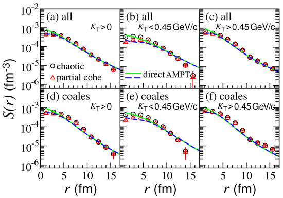 Figure 4 shows the one-dimension kaon source functions of chaotic sources (circle symbols) and partially coherent sources (triangle symbols) in Pb-Pb central collisions at TeV using the AMPT model. Here, the solid and dashed lines are the results directly extracted from the AMPT model for the chaotic and partially coherent sources, respectively. The left, middle, and right columns show the results in the kaon pair transverse momentum intervals, , , and GeV in the laboratory frame, respectively. The top and bottom rows show the results for all the identical (negative) kaons and the kaons generated by quark coalescence, respectively. One can see that the source functions of the partially coherent sources are lower than those of the chaotic sources at a small r. The source functions obtained using the imaging technique are approximately consistent with those extracted directly from the AMPT model.
