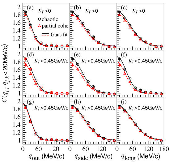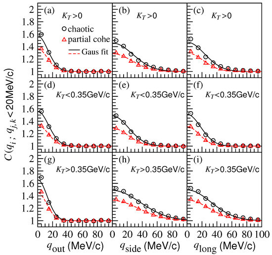 Figure 7 shows the two-kaon correlation functions in the out, side, and long directions for the chaotic sources (circle symbols) and partially coherent sources (triangle symbols) in Pb-Pb central collisions at TeV using the AMPT model. Here, the solid and dashed lines are the correlation function curves for chaotic and partially coherent sources, respectively, fitted with Equation (16). The top, middle, and bottom rows show the results in the kaon pair transverse momentum intervals, , , and GeV, respectively, in the laboratory frame. The correlation function intercepts near zero relative momenta for the partially coherent sources are lower than those for chaotic sources in the low transverse momentum interval.