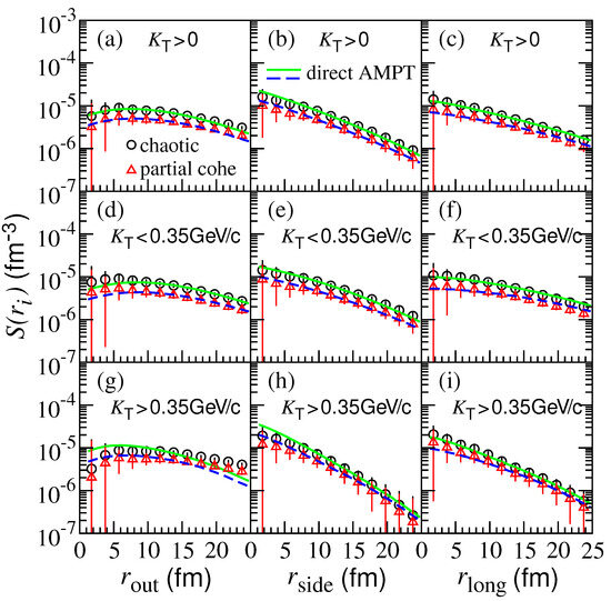 Figure 8 shows the three-dimension kaon source functions ( out, side, long) of the chaotic sources (circle symbols) and partially coherent sources (triangle symbols) in Pb-Pb central collisions at TeV using the AMPT model. Here, the solid and dashed lines are the results directly extracted from the AMPT model for the chaotic and partially coherent sources, respectively. The top, middle, and bottom rows show the results in the kaon pair transverse momentum intervals, , , and GeV, respectively, in the laboratory frame. One can see that the source functions obtained using the imaging technique are consistent with those extracted directly from the AMPT model. The source functions in the out direction are flat with respect to the relative coordinate. The differences between the kaon source functions of the chaotic and partially coherent sources are smaller compared with the pion source functions (see Figure 6).