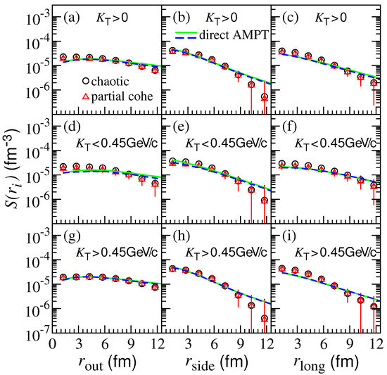Figure 2 shows the one-dimension pion source functions of chaotic sources (circle symbols) and partially coherent sources (triangle symbols) in Pb-Pb central collisions at TeV using the AMPT model. Here, the solid and dashed lines are the results directly extracted from the AMPT model (plotting the average boson freeze-out relative coordinates provided by the AMPT model) for the chaotic and partially coherent sources, respectively. The left, middle, and right columns are the results in the pion pair transverse momentum intervals, , , and GeV in the laboratory frame, respectively. The top, middle, and bottom rows show the results for all the identical (negative) pions, the pions generated by quark coalescence, and the pions generated by particle scattering and decay, respectively.